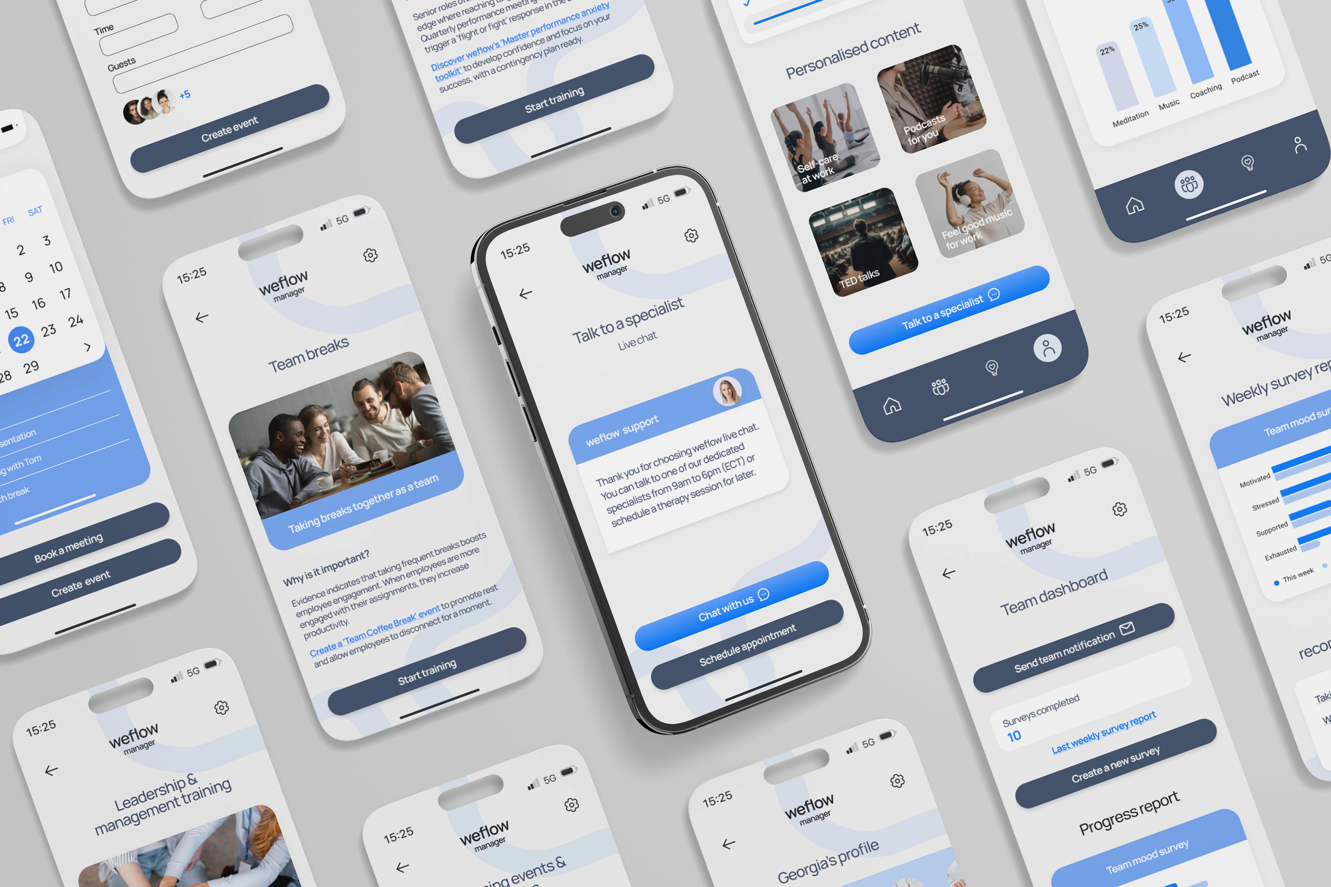 Taking into account we were addressing issues with mental health and well-being primarily in the corporate world, we believed that the main attributes to describe the weflow brand and design were: sophisticated, professional and reliable.